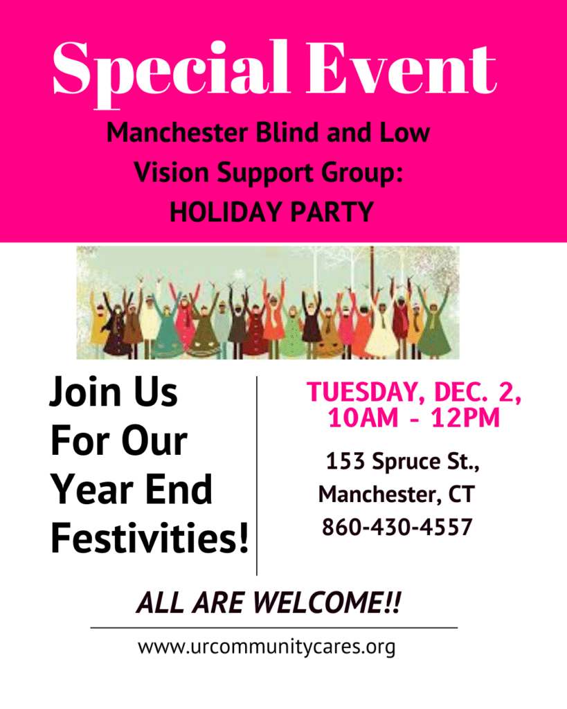 I’d like to get to meet fellow people with vision loss, how can I do that? Call us at 860-430-4557 and we can tell you events, other vision organizations and state services, and other low vision support groups around the state.