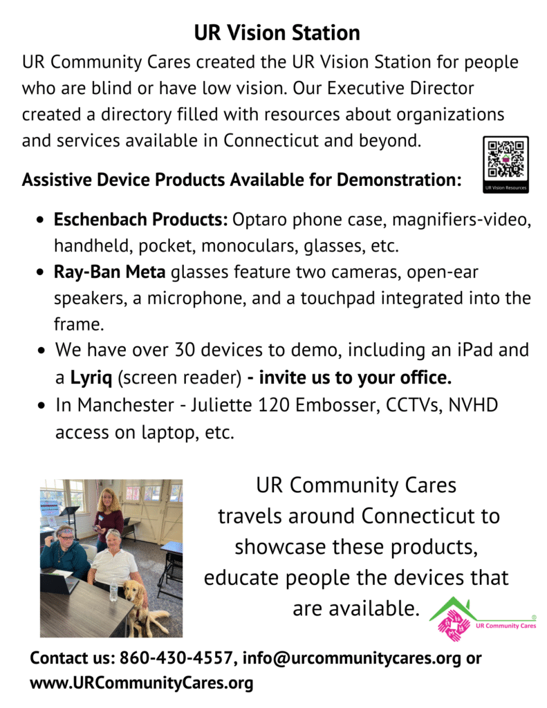 In January 2025, UR Community Cares launched UR Vision Station to support residents who are blind or low vision. This free service is funded by AARP Connecticut’s Livable Communities, Manchester ARPA, and Dime Bank Foundation grants.