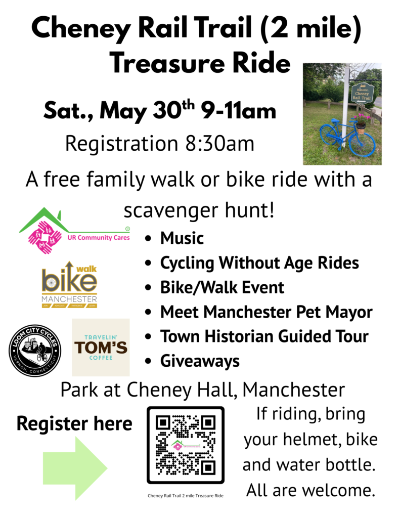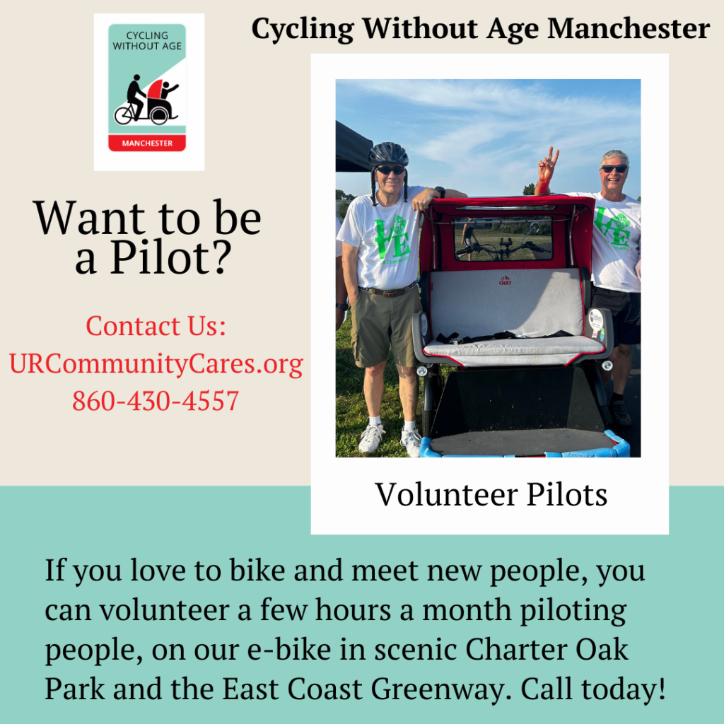 The Cycling Without Age Manchester model is to go to nursing homes, assisted living facilities, and community events. We also schedule one-on-one rides for people. is located in Charter Oak Park, 50 Charter Oak St, Manchester, CT 06040. This program was made possible by grants and donations. Thanks to the Town of Manchester Recreation Department for your partnership on this program.