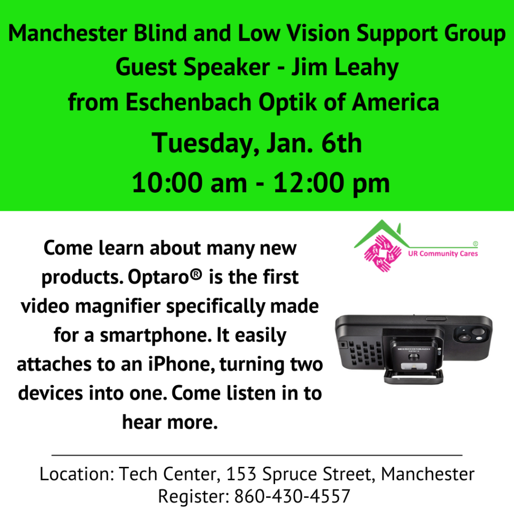 I’d like to get to meet fellow people with vision loss, how can I do that? Call us at 860-430-4557 and we can tell you events, other vision organizations and state services, and other low vision support groups around the state.