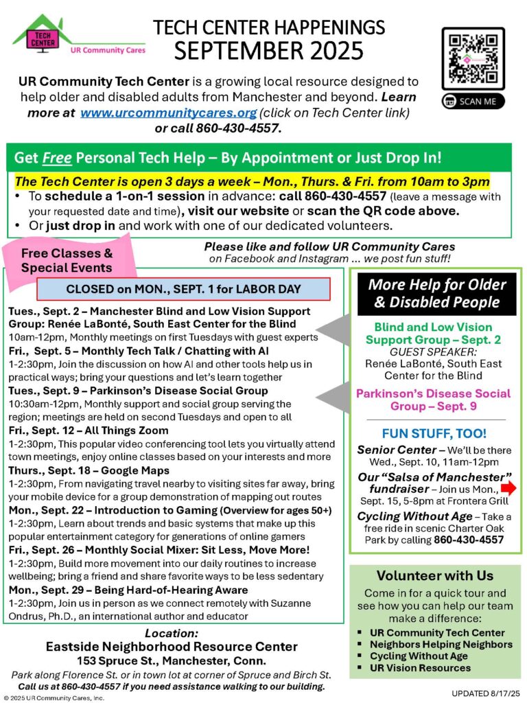 UR Community Cares Tech Center is located at 153 Spruce Street, Manchester, CT (1st floor of Eastside Neighborhood Resource Center).